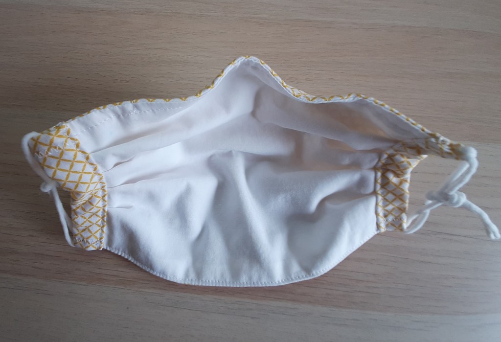 Les élastiques ayant été vite en rupture de stock autant dans ma petite réserve que dans les magasins, je fis d’abord des lots de masques avec attaches de coton. Ils sont très adéquats pour un port de longue durée car ils s’ajustent fermement sans incommoder les oreilles.