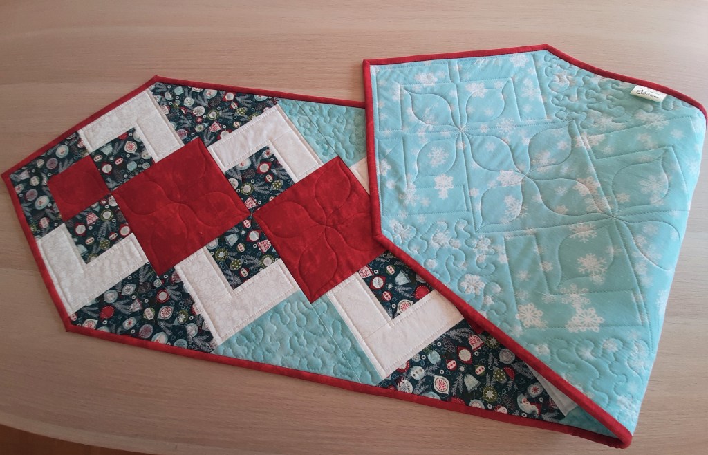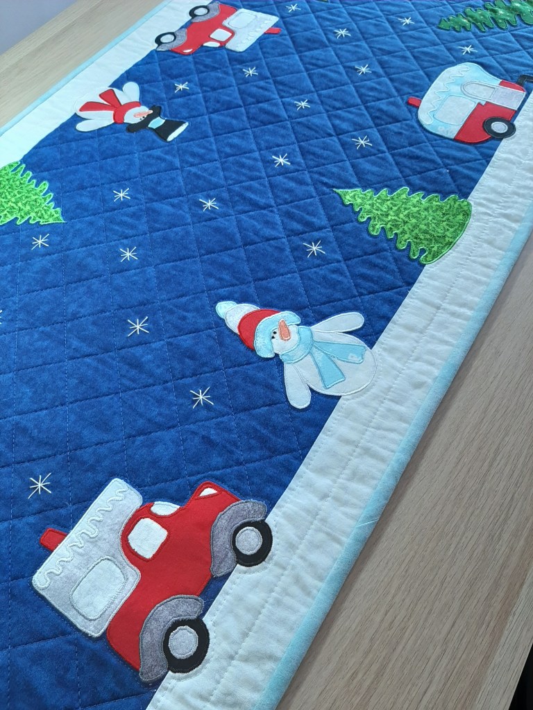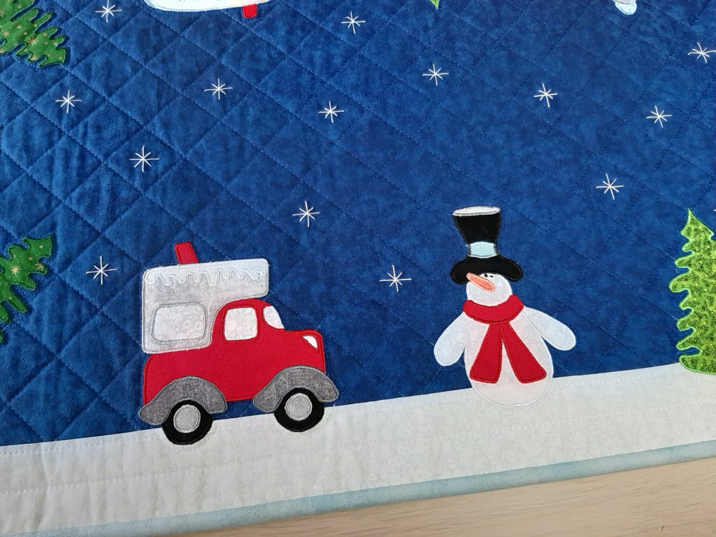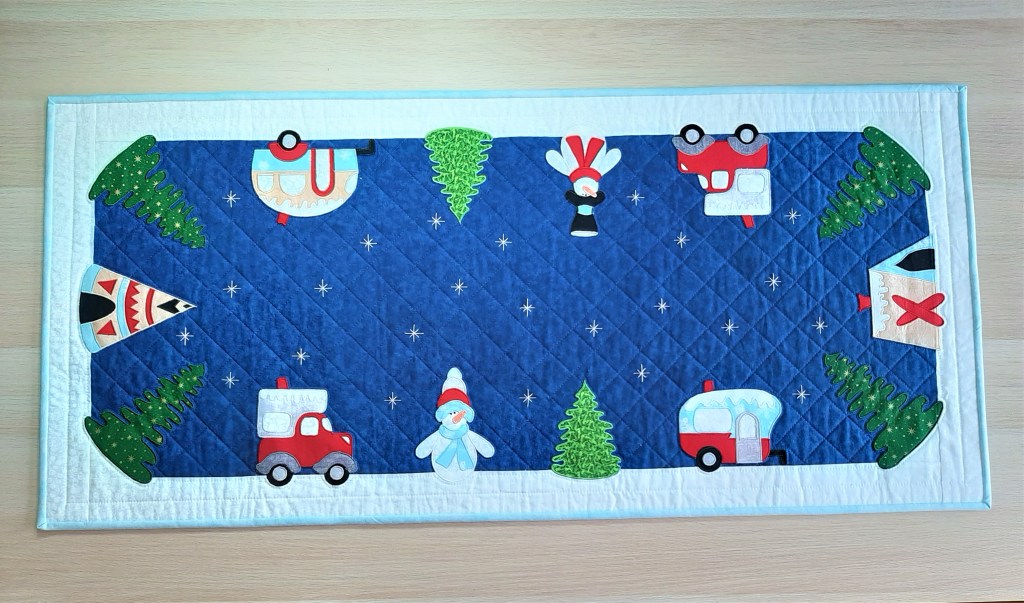 2) Voici maintenant un amusant chemin de table pour égayer le buffet ou la table d’hôte d’hiver ou du temps des Fêtes. De dimension 20po. x 44po. il est constitué d’appliqués amusants qui font une ronde autour d’un ciel de nuit. Parcourez le diaporama pour visualiser les détails. Inspiré d’un modèle de Annie’s Craft.