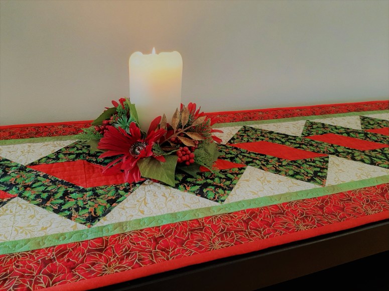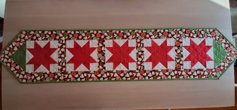 4) Chemin de table aux teintes chaudes à motif d’étoiles rouges feu entourées de biscuits, pour garnir joyeusement la table de Noël. Dimension 13 x 62. Cette pièce est déjà vendue. Parcourez le diaporama.
