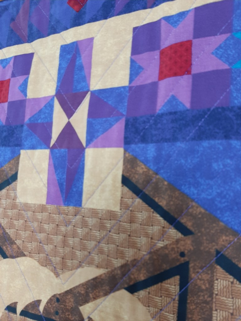 Le résultat final me semble assez réussi et accrocheur. Cela montre un peu que le résultat final d’une pièce de courtepointe est la plupart du temps difficile à imaginer au début du travail lorsqu’on agence les tissus, et donne des résultats surprenants à la fin.