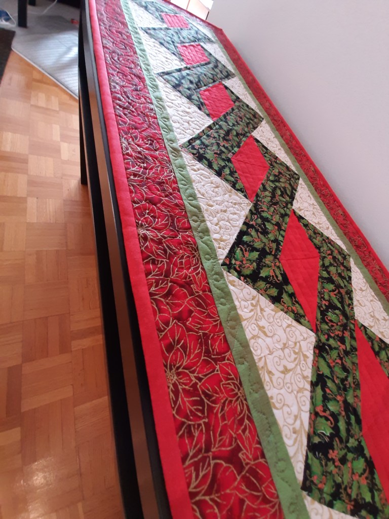 7) Cette pièce a été faite à titre d’expérimentation. NOËL inscrit au centre en lettres brodées à la machine agrémentées de motifs des Fêtes. Par sa dimension de 24 x 24, elle peut servir de centre de table. Parcourez le diaporama.