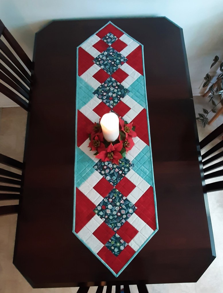 5) Cet autre chemin de table offre un ravissant contraste mettant en valeur les teintes plus froides de bleu ciel et rouge rosé. Dimension 15 x 56. Cette pièce est déjà vendue. Parcourez le diaporama.